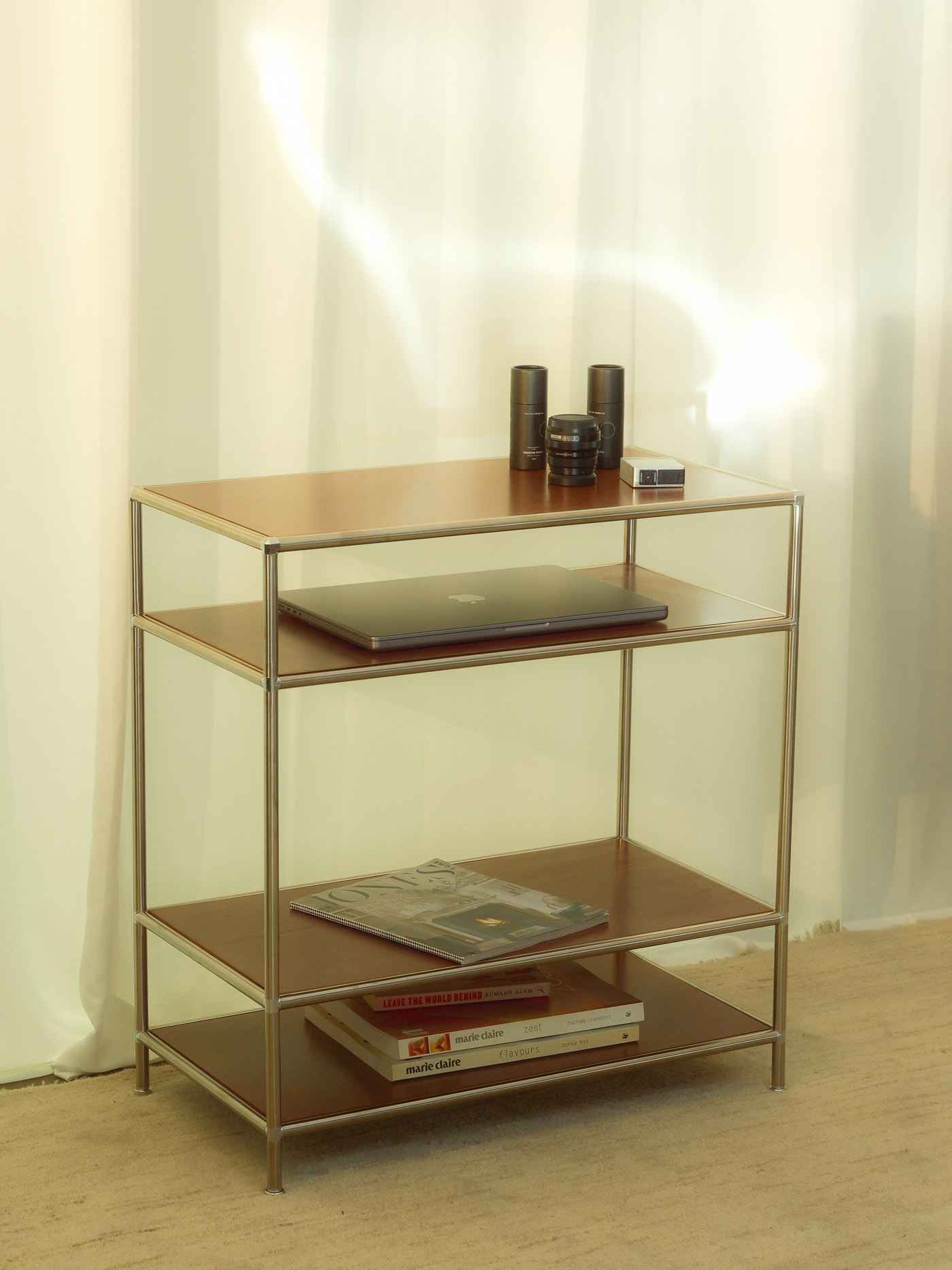 Crafted with high-quality birchwood panels and durable stainless steel connectors, this shelving unit combines natural warmth with sleek, modern design. Its low-profile silhouette makes it a versatile addition to any room.